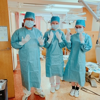 濃厚接触を避けるために感染防護衣を着用して治療をしています。