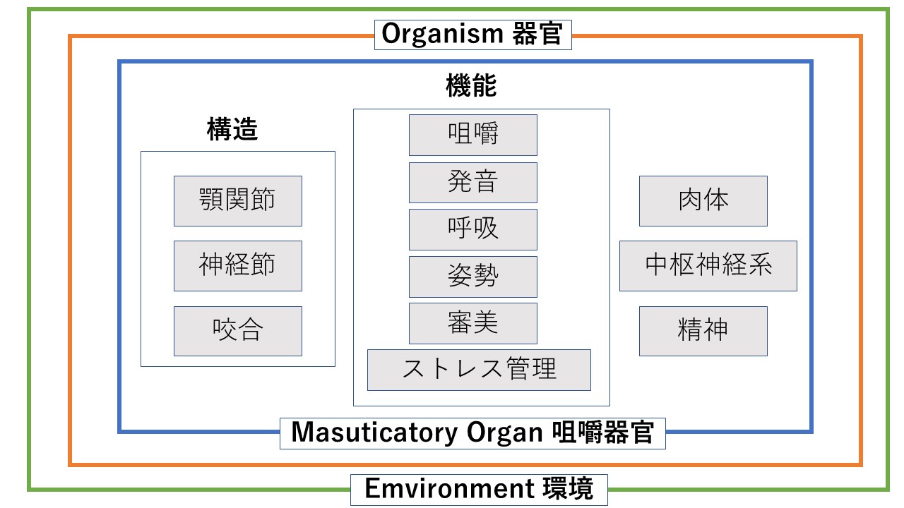 突然変異で巨大な脳を得たサル。咀嚼器官は脳コンピューターに最初から内包されていた様々なアプリケーションを起動した。ヒトの脳というコンピューターと咀嚼器官の関係はまさしくサイバーネティックスである。サイバーネティックスとは、通信機器を人間が使いこなすことから始まり、人間と機械機能のコミュニケーションの確立と融合を提唱する学問である。このサイバーネティックスの根幹をなすものが脳と咀嚼器官の連携であり、咀嚼器官は、咀嚼以外に、発音、呼吸、姿勢、審美、ストレス管理という機能を担っている。