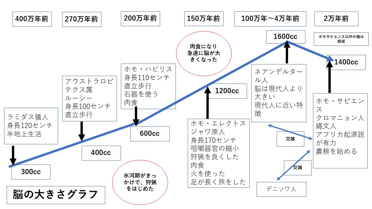 人類は大体700万年くらいの歴史がある。その歴史を大雑把に分類すると。初期の猿人、猿人、原人、旧人、新人の5つに分けられる。一番古い初期の猿人は、チャド(アフリカ)で見つかった700万年前のテヘラントロプス属である。日本では440万年前のラミダス猿人の方が有名である。標本の数も多く東京大学の諏訪元教授らがエチオピア(アフリカ)のアファール盆地で発見した。当時、メディアでも多く取り上げられたようである。人類が類人猿から分かれて独自の道を歩み始めた際の一つの指標は、地上性の生活だ。そこでまず半樹上性・半地上性の「初期の猿人」が現れた。初期の猿人であるラミダス猿人は、森林から平原への生活へと適応していく過渡期にあった。ラミダス猿人の特徴は、脳の大きさは類人猿のチンパンジーと同じくらいの300cc級であった。身長は120センチくらいで、直立二足歩行への適応が完成していない時期であった。続いては猿人と呼ばれるグループ。より地上性が強くなり直立二足歩行をしていた。年代や地域が異なる様々な種類がいたが分布としてはアフリカだけに限られていた。270万年前に非頑丈型猿人、頑丈型猿人という2つの系統に分かれ、非頑丈型猿人の一部で石器をつかいはじめた種類もいた。頑丈型猿人は頭骨にとさかのようなでっぱりがあったり、頭が横に広がったり、かなり異形で特殊化が極まった人類という印象だが、実は非頑丈型猿人よりもずっと長く生き延びた。そして猿人の代表格はいわゆるアウストラロピテクス属である。その中でも有名な化石に「ルーシー」と呼ばれるものがある。1974年、初期の猿人であるアウストラロピテクス・アファレンシスの化石人骨がエチオピアで発見されたのだが、この化石は一個体の40%分が残る非常に貴重なもので、化石を発見したアメリカの人類学者ドナルド・ヨハンソンによって「ルーシー」という愛称がつけられた。ヨハンソンのチームがキャンプで発見を祝っていた時にビートルズの「ルーシーインザスカイウィズダイアモンド」という名曲が流れていて、この化石に「ルーシー」という名前を付けたことはあまりにも有名だ。ちなみにLSDという意味もこの曲にはある。「ルーシー」が属するアウストラロピテクス・アファレンシスは、猿人の代表格であるアウストラロピテクス属の中でも古い種である。アウストラロピテクス属はレイモンド・ダートによって発見された猿人の種類である。骨盤があり直立歩行をしている。上下顎骨など咀嚼器官が発達している。脳の容量が平均500ccほどと現代のゴリラとほぼ一緒である。「ルーシー」はアウストラロピテクスの全身の骨格が明らかになった初めてのケースで、体長約100センチ脳の容量は400ccほどとみられていた。「ルーシー」の復元標本と化石レプリカは国立科学博物館などで見ることができる。およそ200万年前になるとアフリカで原人が登場した。最初の原人ホモ・ハビリスは猿人よりも少し脳容積が大きく歯や顎が縮小した人類だった。猿人との違いは、石器への依存度が高く、肉食をよくするなど文化や行動面でも猿人とは大きく違っていた。ホモ・ハビリスはホモ属だ。ここで注目すべきは、ホモとは現生人類ホモ・サピエンスについている属の名前と同じだということだ。ホモ・ハビリスは最初のホモ属とされている。初期の猿人も猿人も脳容積はあまり変化していない。しかしホモ・ハビリスが一歩を踏み出しそれ以降は現生人類に至るまで時代とともに脳容積がどんどん増大している。ホモ・ハビリスの脳容積事態は600ccを超えるくらいで大きいものでも800ccを超えることはなかった。身体は猿人より大きいがそれほど大柄ではなかったようだ。しかしそこから先の伸びしろがすごいものだった。