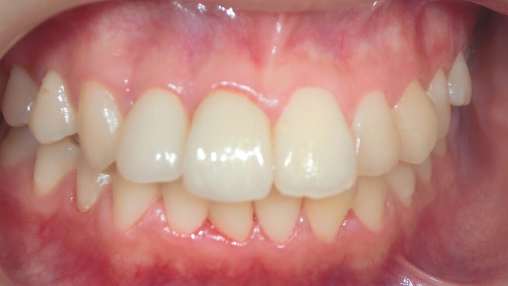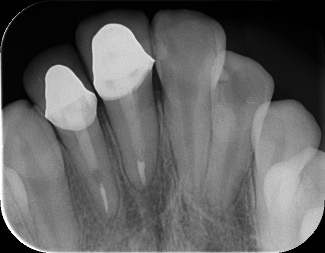 土台は歯にやさしいファイバーコアを使用。前歯の虫歯の原因となった、夜間のはぎしりにも考慮して前歯を作りました。