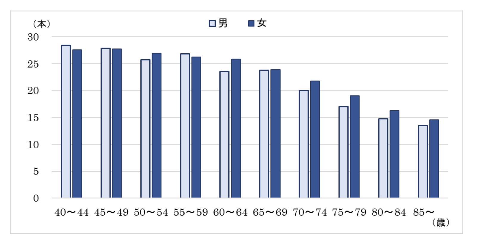 例えば、スウェーデンといった歯科医療が進んでいる国々では、2013年時点での80歳以上の人の平均的な歯の本数が21.1本と報告されています(出典:swedish dental journal vol.39 2015)。