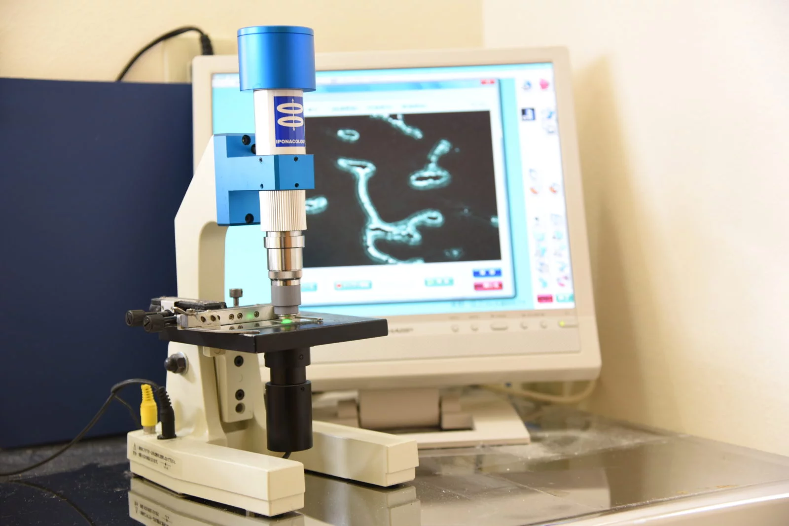 位相差顕微鏡という種類の光学顕微鏡を使用して、口腔内の細菌の種別やその活動状況を詳しく調べます。